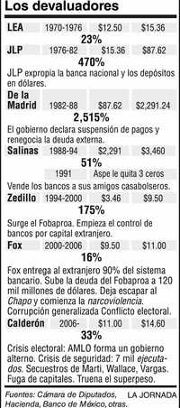 No cede la especulación, ayer el dólar se vendió en $14.60, como promedio. De 1976 a la fecha, cinco presidentes del priísmo y dos del panismo, sin que el país estuviera en guerra con otra nación, han logrado lo que se antoja imposible: depreciar la moneda nacional en más de 100 mil por ciento. (Ver gráfica).