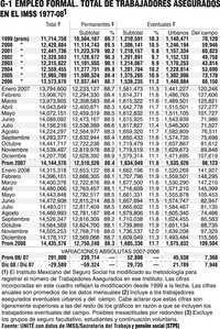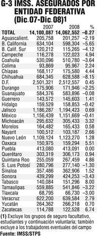 Utilizando como indicador del empleo formal el número de trabajadores asegurados en el Instituto Mexicano del Seguro Social (IMSS), éstos totalizaron 14 millones 178 mil en diciembre de 2008 contra 14 millones 208 mil un año antes; esto es, entre diciembre de 2007 y el mismo mes de 2008 no sólo no se crearon empleos formales sino incluso desaparecieron -29 mil 589 plazas (Gráfico 1).