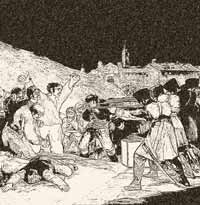 Pero si otra vez tu país es invadido, si vuelve en la misma noche del pájaro el disparo, la presa lista para el tigre, los cuervos en el luto, sin titubeos repite lo que hiciste: como fiera herida, sal a la calle –sea en Madrid o Varsovia, Santiago o México-, y con la camisa aún manchada de comida, deja atrás en tu casa al hijo pequeñito, a la mujer fregona, el gusto bueno por el vino malo, la cebolla que llora por llorar, el solomillo a medias, y con lo que haya a la vista –pistola, daga, lanceta-, encamínate a la plaza, forcejea, lucha, dispara, apuñala al enemigo, para que una vez sepan, por una sola vez, por una sola noche, que defendiste el país, eso, eso que suave, entrañable y mente y corazona, aunque tus restos se pudran bajo tierra y no tengas a un Goya que te pinte.