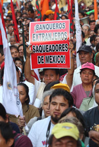 Integrantes del movimiento en defensa de la economía popular, el petróleo y la soberanía, encabe- zados por Andrés Manuel López Obrador, realizaron un mitin frente a la Asociación Mexicana de Bancos Foto José Carlo González
