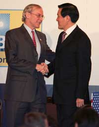 El presidente de Taiwán, Ma Ying-Jeou (derecha), saluda al diplomático estadunidense Stephen Pareja, después de hablar en Taipei ante la Cámara Americana de Comercio sobre las relaciones con China. El primer ministro chino, Wen Jiabao, reconoció que el año pasado mejoraron los vínculos y se redujeron las tensiones entre China y la isla autónoma de Taiwán Foto Ap