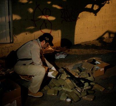 Un policía federal revisa paquetes de mariguana durante el cateo a una casa en la población fronteriza Foto Ap