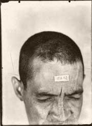 Rosãngela Rennó recopila fotografías de personajes anónimos en los estudios de fotógrafos en diferentes países, en archivos públicos o en álbumes familiares que compra en las tiendas de viejo, y utiliza el valor histórico de la fotografía para denunciar hechos políticos como los desaparecidos –tema que permanece como una llaga abierta en América Latina–, o el maltrato y abuso de las autoridades a los seres marginados, así como la insensibilidad de nuestras sociedades ante las atrocidades que atestiguamos todos los días. La muestra da inicio con una obra de su Serie roja presentada en la Bienal de Venecia de 2003, en la que utilizó imágenes de militares y retratos convencionales de la burguesía manipulados digitalmente a través de un filtro que desvanece la imagen casi hasta desaparecerla, para luego cubrirla de un color rojo intenso que provoca una profunda sensación de violencia. En la serie Vulgo, la artista presenta imágenes de presos de la Penitenciaría de Sao Paulo en las que vemos distintas marcas en sus cuerpos –cicatrices, tatuajes, enfermedades o anomalías físicas– que utilizaron las autoridades como signos de identificación en vez de recurrir a sus nombres propios, anulando así la identidad de los prisioneros y convirtiéndolos en objetos de clasificación taxonómica. Ros ã ngela Rennó ha desarrollado una investigación puntual sobre la memoria de la fotografía, su rol cultural e histórico en la sociedad, y su preocupación se centra en la reflexión sobre la pérdida de la identidad, la ambigüedad entre las presencias y las ausencias, o lo que ella llama el dilema de “la presencia desaparecida” a través de retratos metafóricos “de una sociedad de la exclusión y la inamovilidad social”.