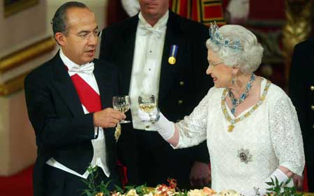 El presidente Felipe Calderón fue agasajado con una cena por la reina Isabel II, en el Palacio de Buckingham. El visitante, su esposa y su comitiva fueron hospedados en el histórico inmueble. El Presidente también se reunió ayer con el primer ministro Gordon Brown, con quien dialogó sobre la cumbre de líderes del Grupo de los 20, que se realizará en la capital británica en torno a la crisis económica Foto Ap