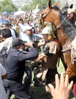 Policías y centuriones se enfrentan en Iztapalapa durante la representación de la muerte de Cristo. En el cerro de la Estrella, los agentes cerraron el paso a los creyentes, quienes respondieron lanzando botellas vacías Foto Guillermo Sologuren