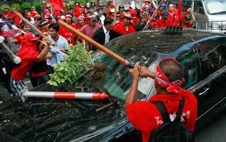 Al menos 70 personas resultaron heridas, dos en estado grave, durante una operación del ejército para contener la serie de protestas que obligaron el sábado a suspender la cumbre de la Asociación de Naciones del Sudeste Asiático. Al menos medio centenar de opositores, conocidos como camisas rojas, irrumpieron en el Ministerio del Interior en busca del primer ministro Abhisit Vejjajiva. Los manifestantes también atacaron una limusina (en la imagen), en la que suponían que se encontraba el gobernante. La policía los repelió con disparos al aire Foto Reuters