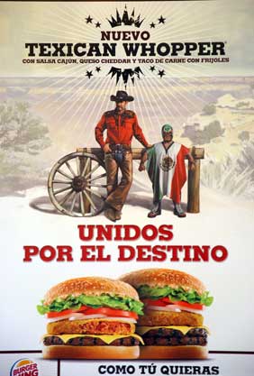 La trasnacional estadunidense Burger King promueve en España uno de sus alimentos con la imagen de un vaquero fornido y alto junto a un chaparro, gordo y desaliñado luchador que viste un jorongo hecho con la bandera mexicana. La embajada de México envió una carta a la empresa para exigirle que retire la campaña