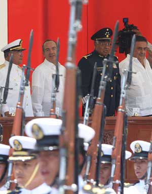 El presidente Felipe Calderón encabezó la ceremonia por el 95 aniversario de la defensa del puerto de Veracruz. En el acto estuvo acompañado por los titulares de las fuerzas armadas, así como por otros integrantes del gabinete de seguridad Foto Francisco Olvera