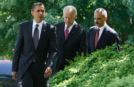 Barack Obama, seguido por el vicepresidente Joe Biden y el procurador general Eric Holder, se dirige a un acto de premiación a los mejores policías, en la Casa Blanca Foto Ap