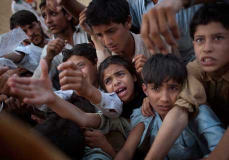 Niños esperan la entrega de ayuda alimentaria en el campo de refugiados Chota Lahore, en Swabi.La secretaria de Estado estadunidense, Hillary Clinton, dijo el martes que su gobierno destinará 110 millones de dólares en apoyo humanitario para mejorar la situación de los desplazados en el valle de Swat, escenario de enfrentamientos entre el ejército de Pakistán y el talibán Foto Ap
