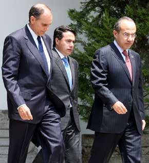 El Presidente encabezó en Los Pinos el acto en el que un grupo de firmas trasnacionales se comprometió a invertir 6 mil 300 millones de dólares este año y generar 27 mil 300 empleos. El mandatario expresó que si bien el país enfrenta ajustes severos, está en un proceso de transición hacia la recuperación. Lo acompañan Julio de Quesada, titular del Consejo de Empresas Globales, y Gerardo Ruiz Mateos, secretario de Economía Foto José Antonio López