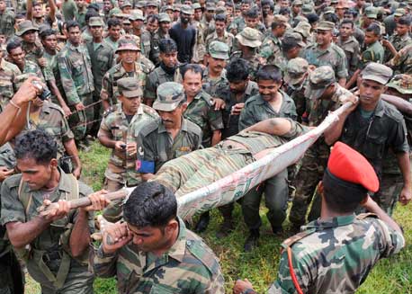 Soldados del ejército de Sri Lanka transportan el cadáver del líder de Los Tigres de Liberación de la Tierra Tamil, Vellupillai Prabhakaran, cerca la localidad de Mullaittivu, en el norte del país asiático Foto Reuters