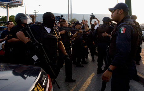 Unos 150 policías federales estuvieron a punto de enfrentarse a tiros con un número similar de agentes municipales de Escobedo, San Nicolás de los Garza, Guadalupe y Apocadaca, que bloqueraron durante cuatro horas vialidades en protesta por los maltratos sufridos por compañeros en los operativos que realiza el Ejército desde hace una semana en 18 de los 51 municipios de la entidad. Hubo un momento en que integrantes de ambos bandos cortaron cartucho. Siete de los manifestantes fueron detenidos Foto Reuters