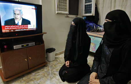Dos mujeres palestinas escuchan en Nablus el mensaje de Benjamin Netanyahu, primer ministro israelí, quien dijo que apoyaría la instauración de un Estado palestino siempre y cuando Israel reciba garantías de que la nueva nación no tendría fuerzas armadas. También se negó a acceder a las demandas estadunidenses de detener la expansión de asentamientos en territorios ocupados. Un portavoz del presidente palestino Mahmoud Abbas calificó de