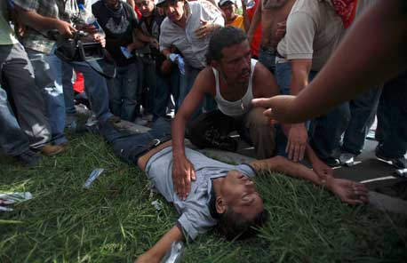 Cientos de partidarios del derrocado presidente Manuel Zelaya fueron atacados con gases lacrimógenos y disparos de francotiradores cuando esperaban el arribo del político en las inmediaciones del Aeropuerto de Toncontin. Según informes de la Cruz Roja hubo una persona fallecida y 12 heridos (uno en la imagen), pero un oficial de la Policía Nacional afirmó que eran dos los muertos Foto Reuters