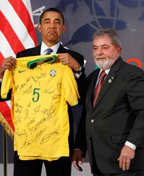 Barack Obama muestra la camiseta que le obsequió Luiz Inacio Lula da Silva con las firmas de los seleccionados de Brasil, durante la reunión de las naciones integrantes del Grupo de los Ocho y del Grupo de los Cinco, a los que se sumaron Egipto y Suecia, en L’Aquila, Italia. En la declaración de la cumbre, las potencias se comprometieron a apoyar a los países en desarrollo a resistir el impacto de la recesión Foto Reuters