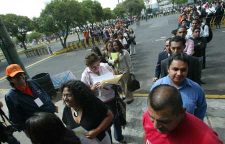 Más de 20 mil personas de diversos estratos sociales acudieron a la vigésima Feria del Empleo de la Ciudad de México, en el Palacio de los Deportes, la cual ofrece 11 mil vacantes en 147 empresas y 15 instituciones. Al inaugurarla, Marcelo Ebrard, jefe de Gobierno del Distrito Federal, expuso que el desplome en la economía afectó de manera sustancial los puestos laborales. El secretario de Trabajo capitalino, Benito Mirón, dijo que aunque se han generado 100 mil plazas anuales, se perdieron 35 mil de octubre de 2008 a julio de 2009, por la crisis Foto Cristina Rodríguez