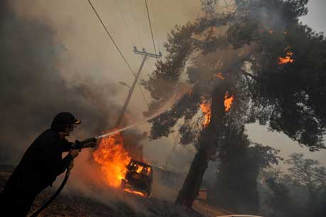 Decenas de casas y más de 12 mil hectáreas de bosques en los alrededores de Atenas fueron consumidas por el fuego; los incendios siguen fuera de control por segundo día. Cientos de personas han huido de sus viviendas desde la noche del sábado. El siniestro se desató el viernes en una aldea ubicada a 40 kilómetros de la capital griega y, debido a los fuertes vientos, se propagó a comunidades vecinas. Se espera que Italia, Francia y Chipre envíen aeronaves contra incendios Foto Ap