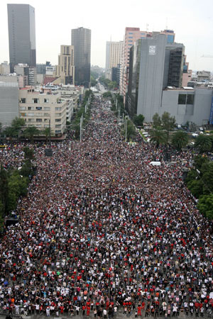 Más de 50 mil personas se congregaron ayer en el Monumento a la Revolución para romper el récord Guinness del mayor número de personas bailando Thriller, de Michael Jackson, como un homenaje al cantante estadunidense, quien habría cumplido 51 años Foto José Antonio López
