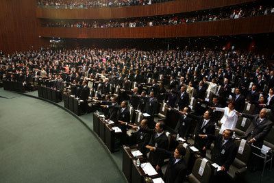 Ayer quedó instalada la 61 Legislatura en la Cámara de Diputados, en una sesión en que 499 integrantes rindieron protesta (sólo faltó Julio César Godoy). En el acto, Ifigenia Martínez, quien encabezó la mesa de decanos, alertó sobre los riesgos de no modificar el ciclo neoliberal que impera en el modelo económico del país. Al concluir la ceremonia, Francisco Ramírez Acuña asumió la presidencia de la mesa directiva de ese órgano Foto José Antonio López