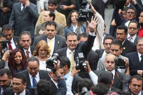 Marcelo Ebrard a su llegada a la Asamblea Legislativa del Distrito Federal. De sus acciones de gobierno destacó la construcción de la línea 12 del Metro y la reducción en los tiempos de traslado mediante el Metrobús. También subrayó el incremento de la capacidad total en el drenaje de la ciudad, el recorte en el sueldo de funcionarios medios y superiores y la disminución en el gasto corriente Foto Carlos Ramos Mamahua