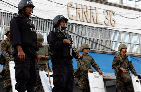 emitir publicación por cualquier medio hablado, escrito o televisado, que ofenda la dignidad, a funcionarios o atente contra la paz y el orden. Esos medios eran los únicos de cobertura nacional que informaban sobre las acciones de la resistencia zelayista Foto Reuters