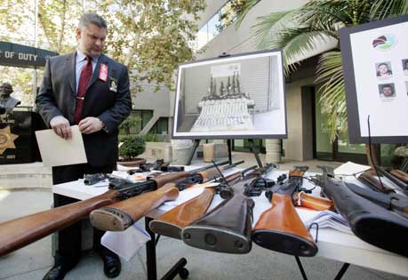 Un agente antidrogas muestra parte de las armas decomisadas al cártel michoacano de La Familia en San Bernardino, California. El procurador general Eric Holder informó que desde hace 44 meses se realiza la operación Proyecto Coronado en Estados Unidos, para desmantelar las redes de ese grupo de narcotraficantes Foto Ap