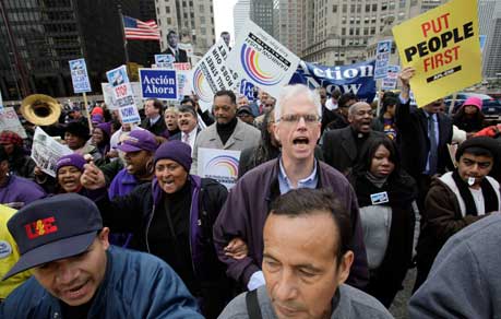 Unos cinco mil sindicalistas y activistas de organizaciones civiles marcharon por el centro de Chicago hacia el hotel donde se realiza la reunión de la Asociación Nacional de Banqueros. Richard Trumka, presidente de la central obrera AFL-CIO, dijo: