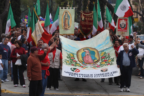 Cientos de electricistas realizaron ayer una peregrinación a la Basílica de Guadalupe, donde no se les permitió el acceso con pancartas ni propaganda. En el recinto mariano el sacerdote José Vallejo oró para que  muchos de ustedes no pierdan su trabajo Foto Francisco Olvera