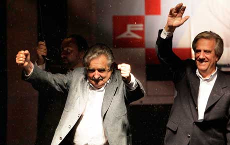 El candidato del Frente Amplio (izquierda), acompañado del presidente Tabaré Vázquez, festeja efusivamente tras ganar la Presidencia en segunda vuelta a la alianza de los partidos Nacional (Blanco) y Colorado. La fórmula Mujica-Danilo Astori, ex ministro de Economía, obtuvo más de 51 por ciento de los votos, según datos oficiales, sobre 44 por ciento del ex presidente conservador Luis Alberto Lacalle y Jorge Larrañaga. El virtual mandatario electo se mostró conciliador. Señaló que los gobiernos son transitorios y que el poder está en el corazón de las grandes masas Foto Ap