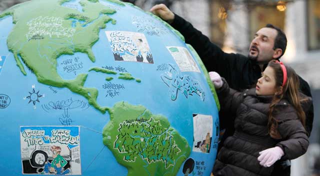 de la esperanza de la humanidad. En la ciudad se han desplegado enormes globos terráqueos para crear conciencia sobre la importancia de la protección ambiental del planeta Foto Reuters