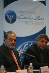 El empresario aportará los fondos a un proyecto sobre mutaciones en siete tipos de cáncer, en diabetes y en insuficiencia renal. Participan el Instituto Carlos Slim de la Salud, el Instituto Nacional de Medicina Genómica y el Broad Institute, que preside el estadunidense Eric Lander (derecha) Foto José Antonio López