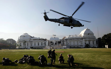 Como en película bélica, uno de cuatro helicópteros Black Hawk de la Marina estadunidense realizó un espectacular descenso en los jardines del derruido Palacio Nacional. Del aparato saltaron medio centenar de marines metralleta en mano. De ahí se dirigieron a un hospital cercano para asegurar la atención humanitaria. Las fuerzas enviadas por Barack Obama también realizaron un desembarco en la derruida ciudad de Leogane. En tanto, la asistencia a los miles de hambrientos en Puerto Príncipe se cumplió ayer parcialmente desde 250 puntos de distribución de víveres Foto Ap