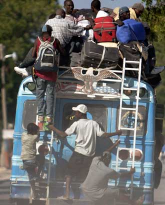 Cientos de haitianos abandonan como pueden la capital de su país tras el terremoto. En la imagen, un autobús repleto se dirige hacia la ciudad de Gonaives. La Organización Internacional para las Migraciones subrayó que se necesitan 100 mil tiendas adicionales para dar abrigo a medio millón de damnificados Foto Ap