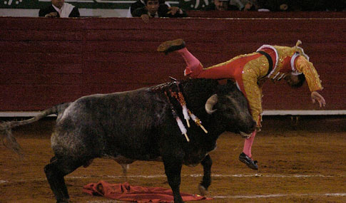 En la corrida nocturna de aniversario del coso de Insurgentes, el torero francés Sebastián Castella se puso del lado del público y se negó a matar a un novillo impresentable de la ganadería Los Ébanos, pese a la presión del empresario Rafael Herrerías y el juez Roberto Andrade. Los asistentes rechazaron ruidosamente al becerrote en cuanto éste pisó el ruedo, pero inexplicablemente el juez de plaza ordenó que prosiguiera la lidia. El artista galo se mantuvo en el burladero y rechazó despachar a Capulín. Al cierre de esta edición trascendió que el matador europeo sería llevado a la cárcel por desacato a la autoridad. Rafael Ortega sufrió una cornada en el quinto de la tarde, pero regresó a concluir su faena Foto Iván Castaneira /Latitudepress