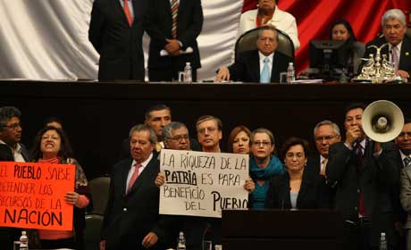 Diputados del Partido del Trabajo, apoyados por algunos perredistas, ocuparon la tribuna de la Cámara de Diputados para exigir que se sometiera a votación el recurso constitucional contra las disposiciones en la paraestatal que permiten otorgar contratos a particulares en toda la cadena de producción de hidrocarburos. Sin embargo, la bancada priísta maniobró y convenció a PAN, PRD, Nueva Alianza, PVEM y Convergencia para que no procediera la petición. Parte del arreglo fue que la secretaría de Energía, Georgina Kessel, enviará al recinto legislativo un documento firmado por ella con cambios sugeridos por el coordinador del tricolor, Francisco Rojas Foto María Meléndrez Parada