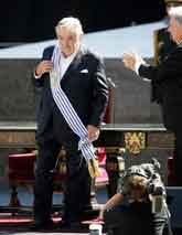 El ex guerrillero tupamaro se ajusta la banda presidencial de Uruguay tras recibirla de su predecesor, Tabaré Vázquez. El mandatario dijo que su país seguirá en el Mercosur