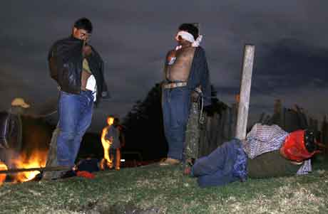 Tres indígenas católicos de la localidad de Mitzitón, a 15 kilómetros de San Cristóbal de las Casas, fueron amarrados por evangélicos durante varias horas tras un enfrentamiento por la posesión de madera, con saldo de una decena de lesionados; el mismo número de retenidos lo tenía el grupo antagónico. Más de 200 policías estatales y ministeriales llegaron y evitaron que se desatara de nuevo la violencia. A las 14:50 horas del martes se logró un acuerdo y ambas comunidades intercambiaron rehenes Foto Moisés Zúñiga Santiago