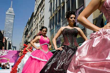 Varias jóvenes modelaron una colección de vestidos creados por más de 20 negocios de ropa del popular barrio de La Lagunilla. El desfile se realizó en la calle de Madero y muchas quinceañeras escogieron el atuendo para la fiesta colectiva que se realizará el 17 de abril en la Plaza de la Constitución, organizada por el Instituto de la Juventud del gobierno capitalino Foto José Carlo González
