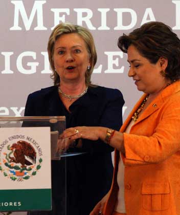 Hillary Clinton, secretaria de Estado estadunidense, y Patricia Espinosa, canciller de México, ofrecieron una conferencia de prensa tras el encuentro sobre seguridad del Grupo de Alto Nivel de ambos países. Las funcionarias anunciaron la ampliación de la Iniciativa Mérida para dar un enfoque integral a la lucha contra el narcotráfico. De igual manera se comprometieron a profundizar la cooperación para abatir al crimen organizado y coordinar las políticas nacionales contra esa amenaza Foto Francisco Olvera
