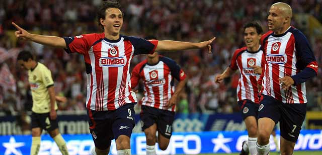 Las Chivas del Guadalajara ganaron 1-0 al América, con gol de Omar Arellano (en la imagen, celebrando) al minuto 35, y retomaron la cima de la clasificación al sumar 31 puntos. De paso pusieron en la cuerda floja al equipo de Televisa, que se rezagó hasta el cuarto lugar del grupo dos. Por si no fuera suficiente, Luis Michel triunfó en el peculiar duelo de porteros, ya que Guillermo Ochoa de nuevo se equivocó y colaboró para que cayera el tanto en su meta. El encuentro estuvo plagado de faltas y conatos de riña Foto Notimex