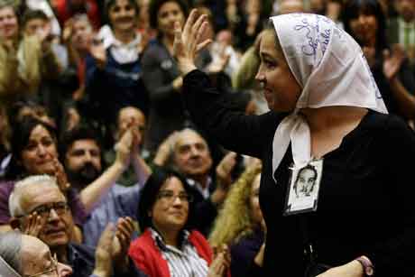 Carla Artes, quien fue robada cuando era bebé por militares argentinos, agradece los aplausos durante el encuentro de cientos de personas en la Universidad Complutense de Madrid para censurar el eventual procesamiento del juez por prevaricación. Ella forma parte de una delegación de las Abuelas de Plaza de Mayo en apoyo de Baltasar Garzón, quien también abrió procesos contra represores sudamericanos. Al acto acudieron representantes y familiares de víctimas del franquismo, así como intelectuales, políticos y estudiantes Foto Reuters