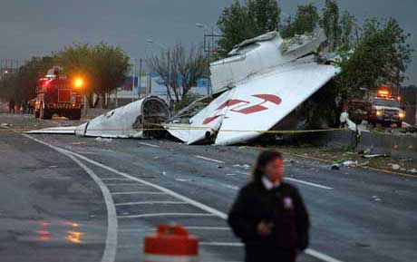 El aparato de carga, propiedad de la empresa AeroUnión, cayó la noche del pasado martes entre el cercado perimetral y la carretera de acceso al aeropuerto internacional Mariano Escobedo, informó la Dirección de Aeronáutica Civil, dependiente de la SCT. En el percance fallecieron los cinco tripulantes; la sexta víctima fue un automovilista que circulaba por el área del siniestro y la séptima aún no ha sido identificada. Después de tres intentos de aterrizaje la aeronave se desplomó. La PGR informó que el Ministerio Público Federal inició una averiguación previa por homicidio y daños en propiedad ajena; asimismo, dijo que indaga desde un accidente hasta un posible ataque del crimen organizado Foto Reuters