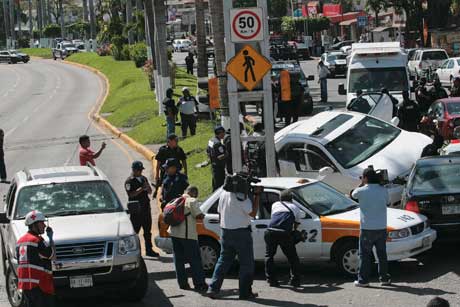 El tiroteo se inició a las 15:40 horas de ayer frente a los hoteles Playa Suite y Hacienda María Eugenia, y continuó hasta la glorieta de la Diana. El enfrentamiento provocó una carambola en la que se vieron involucrados 13 vehículos, de los cuales cuatro quedaron destrozados por impactos de fusiles AK-47 y R-15. Tras el choque, se desplegó un operativo de búsqueda y se detuvo a un individuo en posesión de un arma larga Foto Pedro Pardo