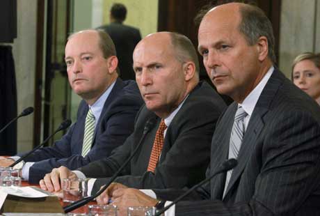 En una audiencia realizada ayer ante el Senado estadunidense sobre el derrame de crudo provocado por la explosión y hundimiento de la plataforma petrolera en el Golfo de México, el 20 de abril, Lamar McKay (izquierda), presidente de British Petroleum America; Steven Newman (centro), de Transocean, dueña de la instalación, y Tim Probert, encargado de Halliburton, la firma responsable de cimentar el pozo, se lanzaron mutuas recriminaciones sobre la responsabilidad del desastre en el que perecieron 11 trabajadores Foto Reuters
