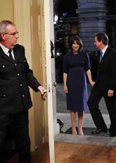 El político conservador y su esposa Samantha llegan al número 10 de la calle Downing, tras acordar un gobierno de coalición con los liberales demócratas Foto Ap