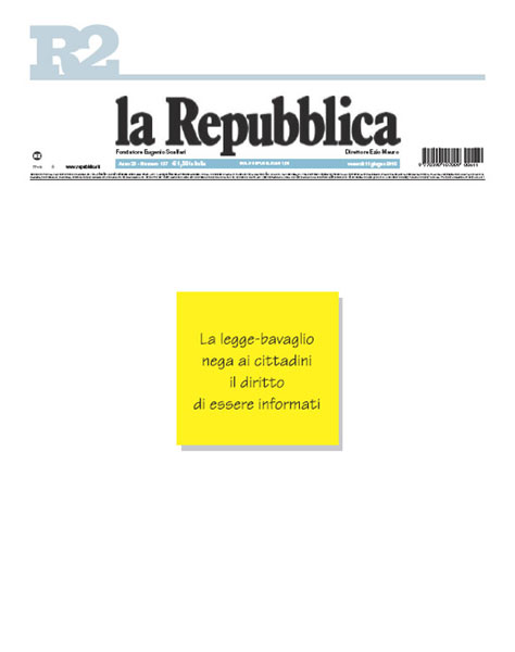 La prensa italiana protestó ayer contra la ley con la que el gobierno de Silvio Berlusconi pretende imponer multas a los medios de comunicación que divulguen datos obtenidos mediante espionaje telefónico policiaco. En señal de descontento, la primera plana del diario La Repubblica apareció en blanco, sólo con una pequeña nota que dice: La ley mordaza niega a los ciudadanos el derecho de ser informados. El sindicato de periodistas convocó a una huelga para el 9 de julio, y prometió una resistencia total, indefinida Imagen tomada de la página electrónica del diario