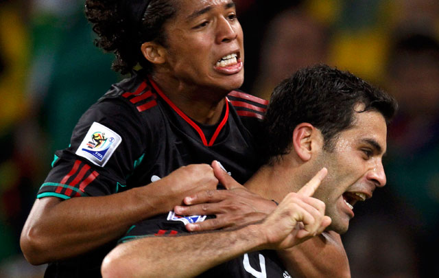Al inaugurar los encuentros del Mundial Sudáfrica 2010 de futbol, la selección mexicana apenas pudo empatar con la escuadra anfitriona 1-1. En el otro partido del grupo A, Francia y Uruguay no se hicieron daño, por lo cual los cuatro equipos se mantienen cada uno con un punto. En la imagen, Giovani dos Santos Y Rafael Márquez celebran el tanto anotado por este último Foto Reuters