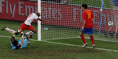 Suiza marcó al minuto 52 gracias a un golpe de fortuna. Tras largo pase del arquero Diego Benaglio, Gelson Fernandes se internó en el área española y envió un tiro que primero atajó Íker Casillas, pero aprovechó el rebote para enviar el balón al fondo del arco. El equipo ibérico acabó desesperado, incapaz de encontrar el remate final que salvara al menos un punto Foto Ap