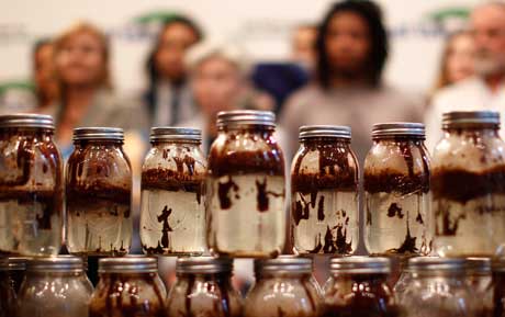 Integrantes del grupo Voces del Golfo llevaron al Capitolio frascos con agua contaminada por el derrame petrolero causado por el hundimiento de la plataforma Deepwater Horizon. En lo que se considera un triunfo, el presidente Barack Obama logró ayer que la petrolera británica creara un fondo especial para cubrir los daños de la marea negra. En México se informó que el gobierno federal demandará a BP por 20 millones de dólares a causa de los daños ecológicos en aguas y bahías nacionales Foto Reuters